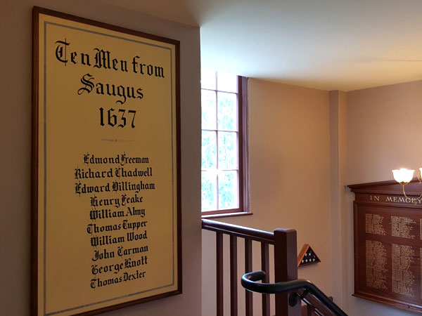 Led by Edmund Freeman, these ten settlers journeyed from Saugus (present-day Lynn) to the shores of Cape Cod, where they established the first town on the Cape under the authority of Plymouth Colony. The plaque, displayed just outside the entrance to the historic meeting hall, preserves the names of the men whose leadership, labor, and resolve laid the foundations of Sandwich, Massachusetts.