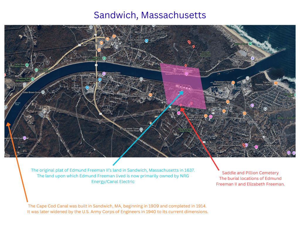 The outline of Freeman’s early farmland—once stretching across salt marsh, meadow, and woodland—now intersects with the twentieth-century engineering of the Cape Cod Canal, reshaping the very ground first settled by the town’s principal founder. Marked prominently is the Saddle and Pillion Cemetery, the secluded burial ground where Edmund and his wife Elizabeth Freeman rest beneath the saddle-shaped stones he chose to symbolize their lifelong journey together.
