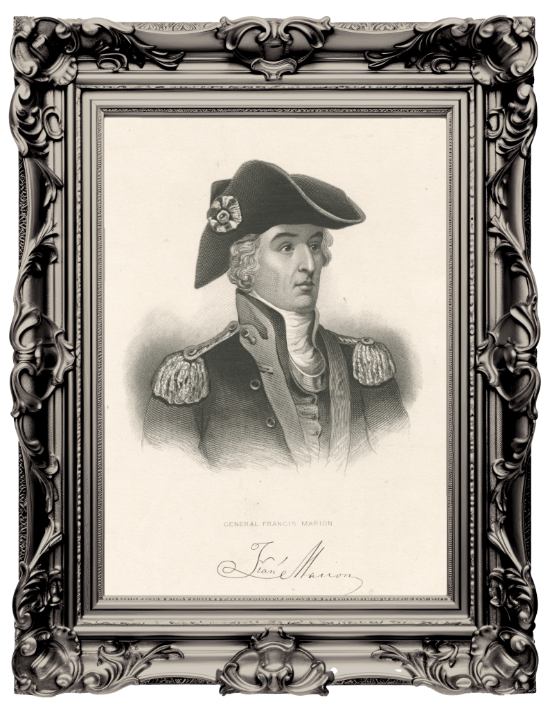 This finely detailed illustration captures the enduring mystique of Francis Marion—“The Swamp Fox”—the Revolutionary War commander whose mastery of guerrilla tactics helped reshape the Southern campaign.